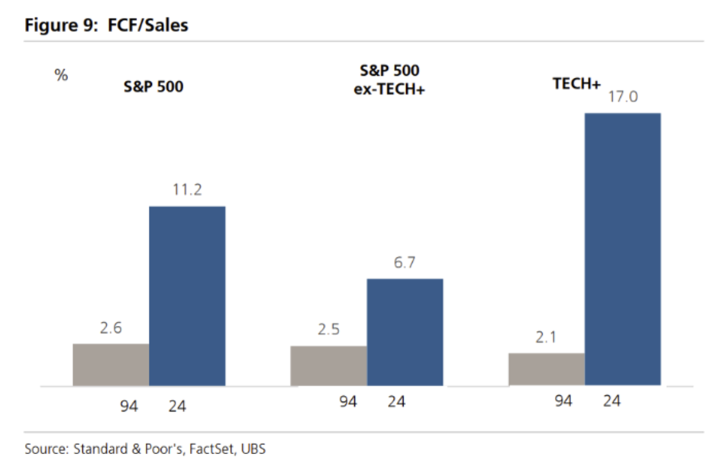 瑞银暗示,当年30年里,标普500指数包含的公司老本密集度还是缩小,因此,不管是科技公司还短长科技公司,现款流王人大大加多,而更高的开脱现款流意味着公司能向鼓励返还更多的资金,因此在市盈率上获取更高的估值稀奇合理。